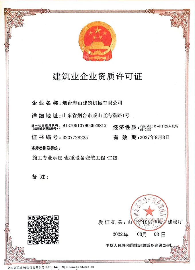 2022年度海山機(jī)械的建筑業(yè)企業(yè)資質(zhì)許可證書(shū),以及特種設(shè)備生產(chǎn)許可證書(shū)均通過(guò)審批,具體如下圖:
